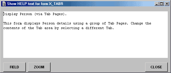This is used to maintain the help text form forms and fields within the XAMPLE application. This data will be displayed using form XAMPLE_HELP.